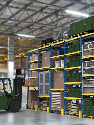 Heavy-gauge, all bolted structural steel construction available in a variety of configurations to adapt to your ceiling height, warehouse layout, and forklift capacity (height and weight). The knock-down construction for shipment purposes eliminates wasted space, maximizing transport effectiveness.